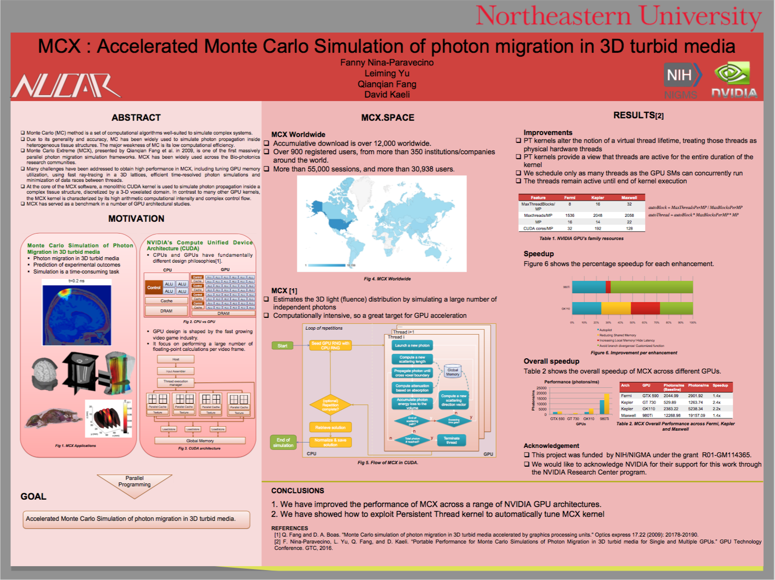 Many challenges have been addressed to obtain high performance in MCX, including tuning GPU memory utilization, using fast ray-tracing in 3D lattices, efficient time-resolved photon simulations, and minimization of data races between threads, however Qianqian Fang and his new colleagues at Northeastern Fanny Nina-Paravecino, Leiming Yu, and David Kaeli, continue to innovate the improvement of MCX's performance across different GPU architectures.